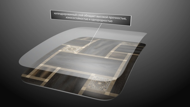 Лицевой и средний слой изготавливается из поливинилхлорида, наполнителей, пигментов, пластификаторов и различных добавок, дополнительно для ряда коллекций используется стеклохолст в среднем слое. Нижний слой линолеума представляет собой нетканый материал.